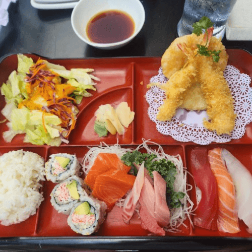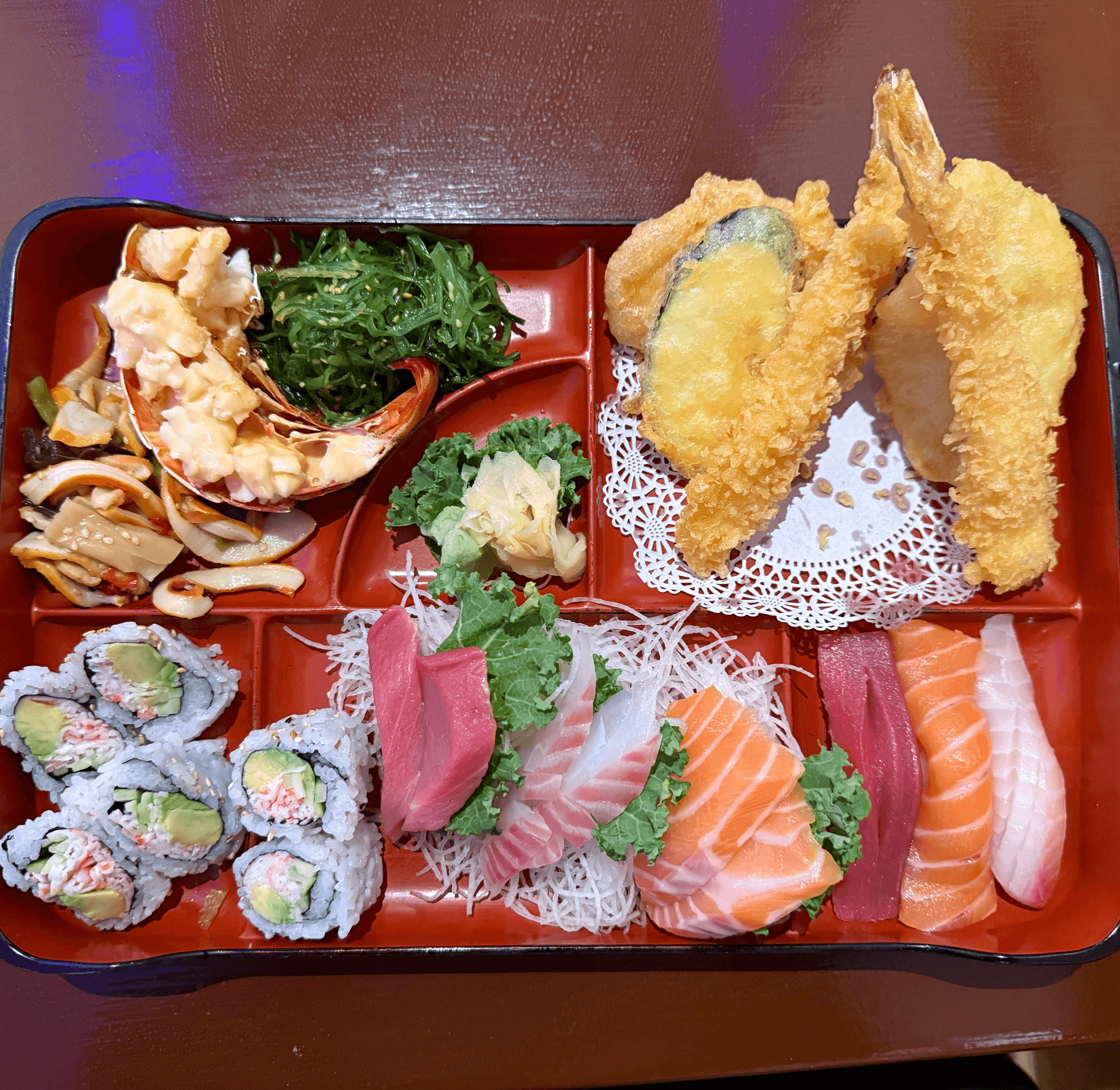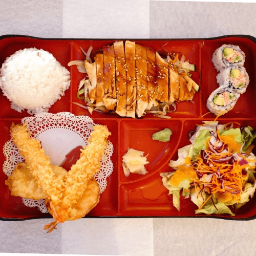 Beef or salmon teriyaki or Bulgogi, shrimp and vegetable tempura, 3 pieces of sushi, and 6 pieces of California roll with seaweed & squid salad