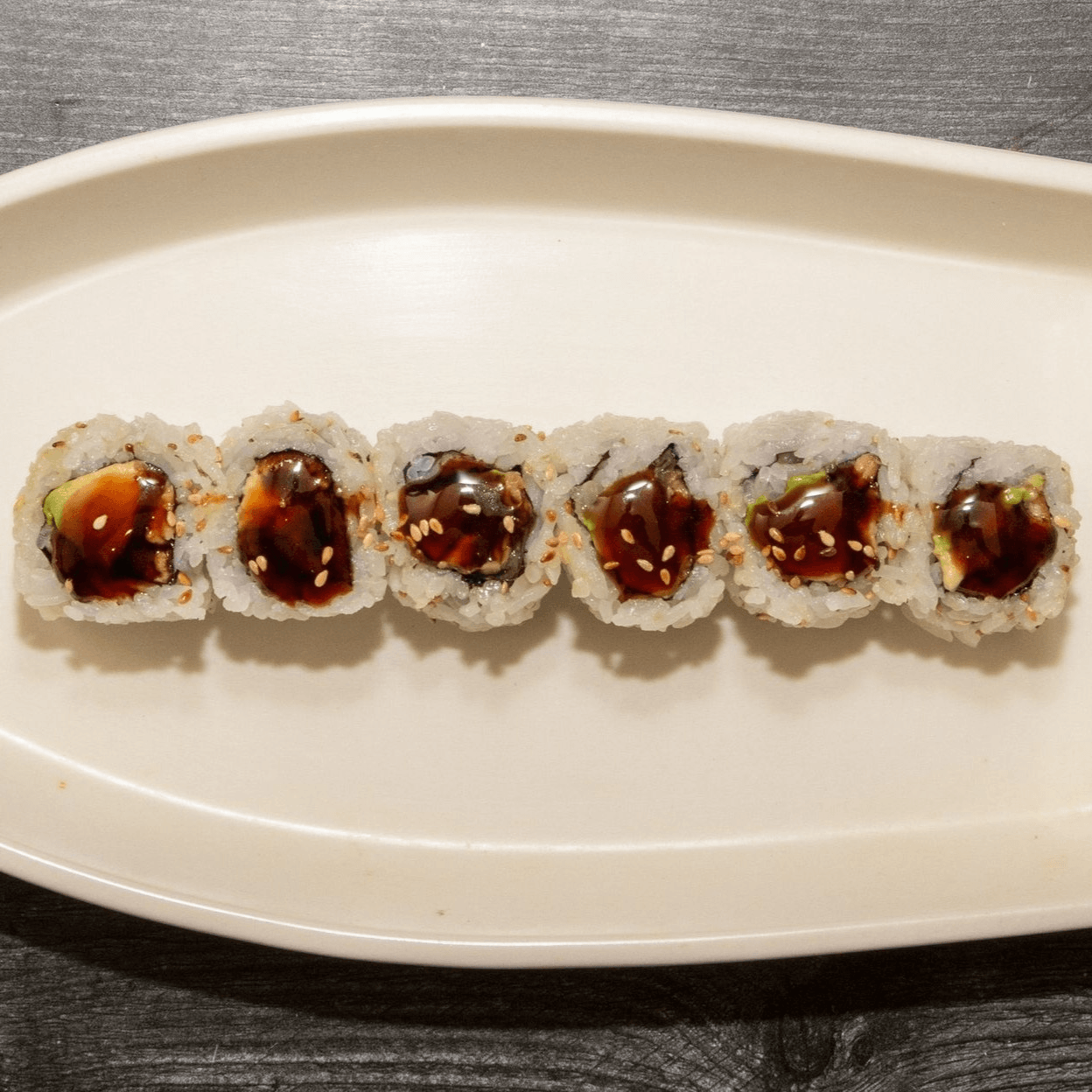 Crab, avocado, and cucumber outside with crunch and eel sauce