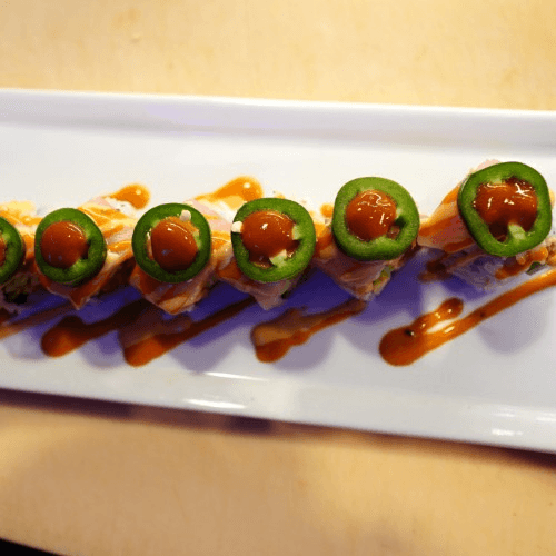 Inside: crab, avocado, cucumber, masago, crunch. Outside: spicy salmon, spicy tuna, sliced jalapeno with hot sauce