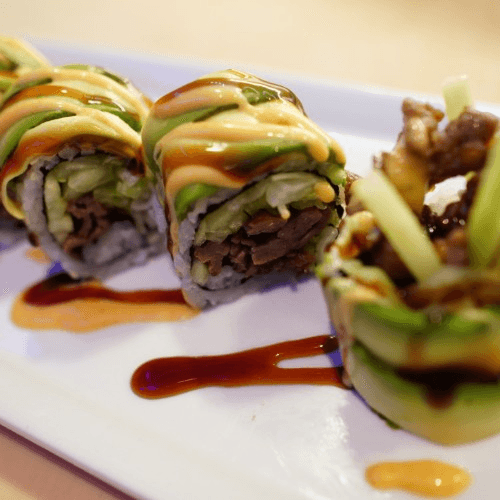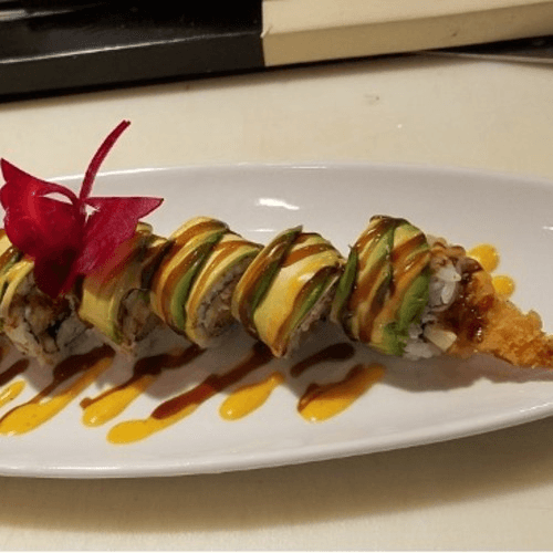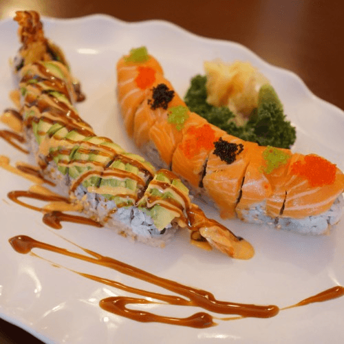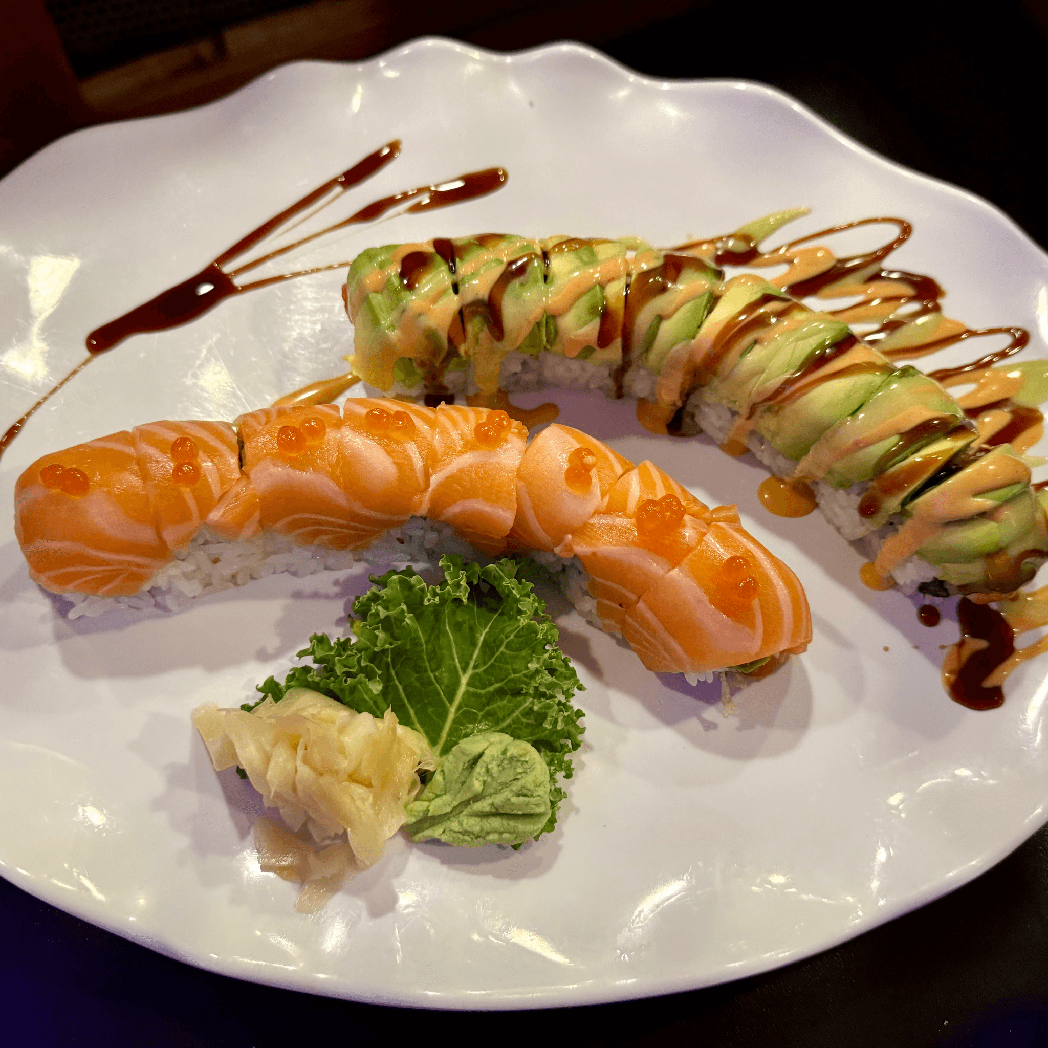 Hawaiian Sunset Roll in : Salmon, Pineapple, Crunch out : Salmon, Tobiko Beach Roll in : Shrimp Tempura, Crab, Cucumber out : Avocado