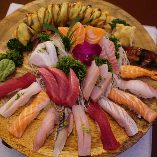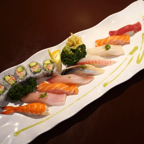 20 pieces of sushi, 24 pieces of sashimi, California roll, rainbow roll, and tuna avocado roll
