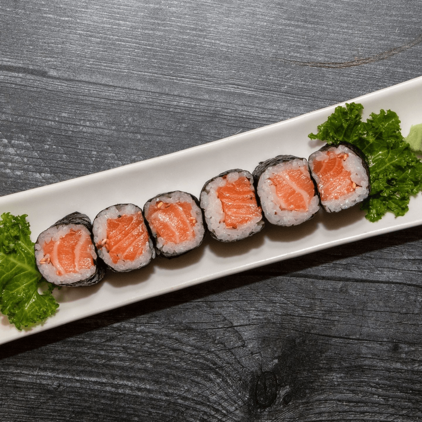 Inside: spicy salmon, avocado, crunch. Outside: salmon, ikura