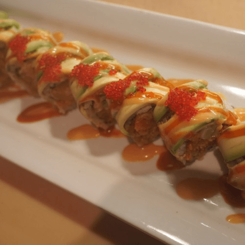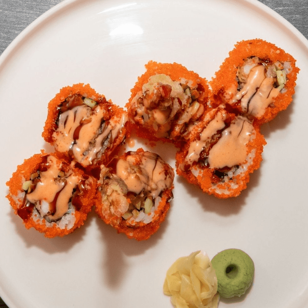 Shrimp tempura, spicy tuna, eel sauce, and masago on the outside