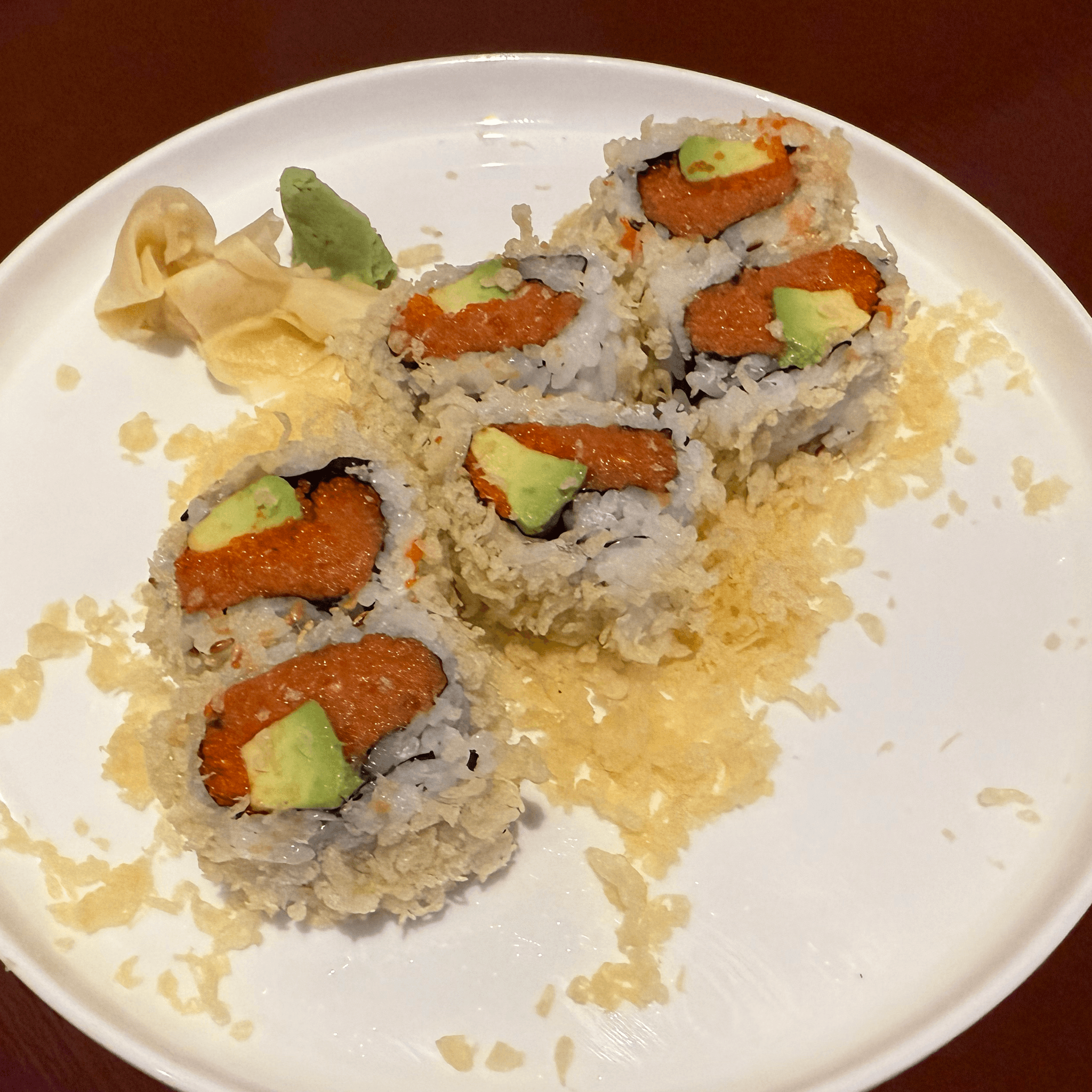 Inside: crab, avocado, cucumber. Outside: spicy crab, tobiko, crunch with spicy mayo