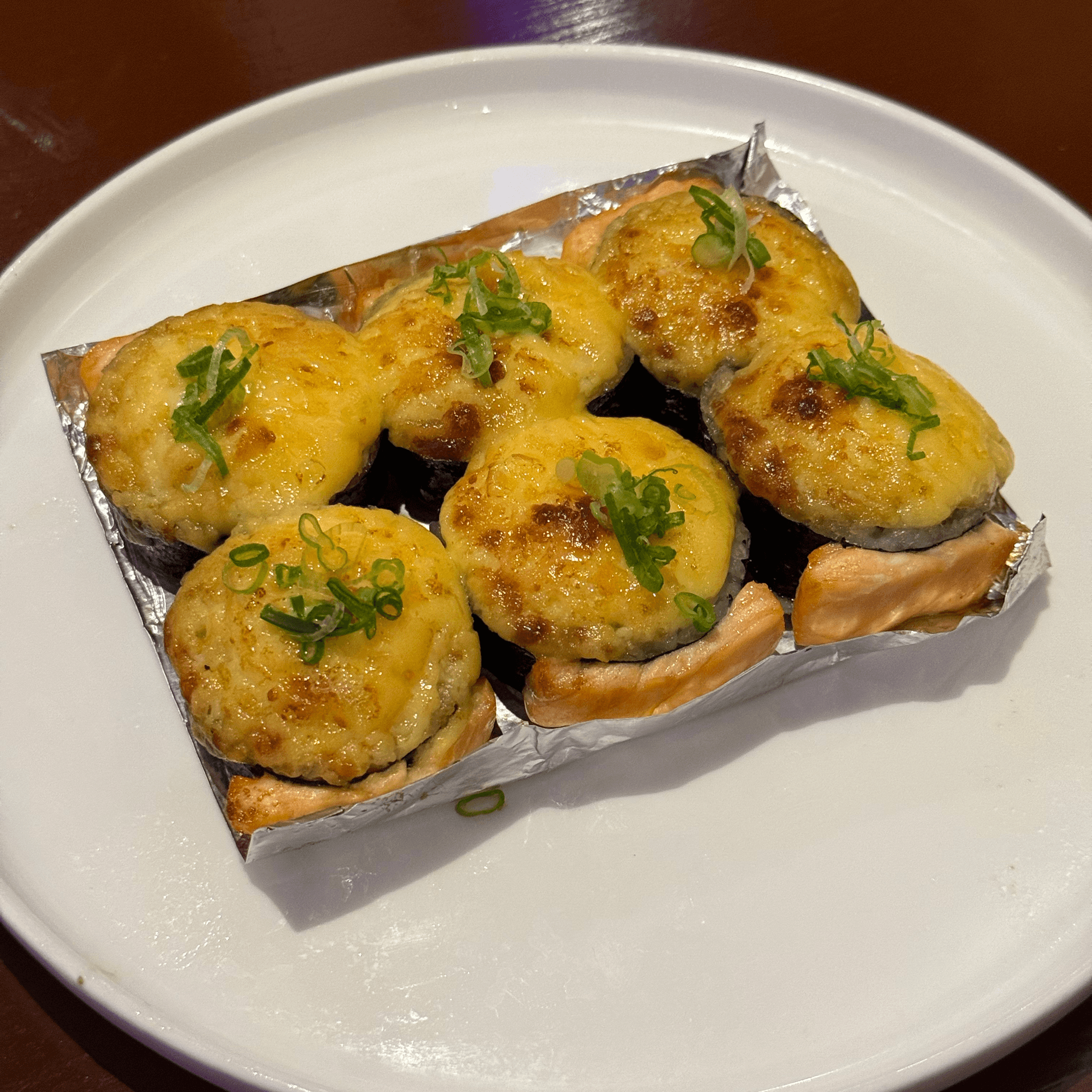 Inside: crab, avocado, jalapeno. Outside: baked salmon
