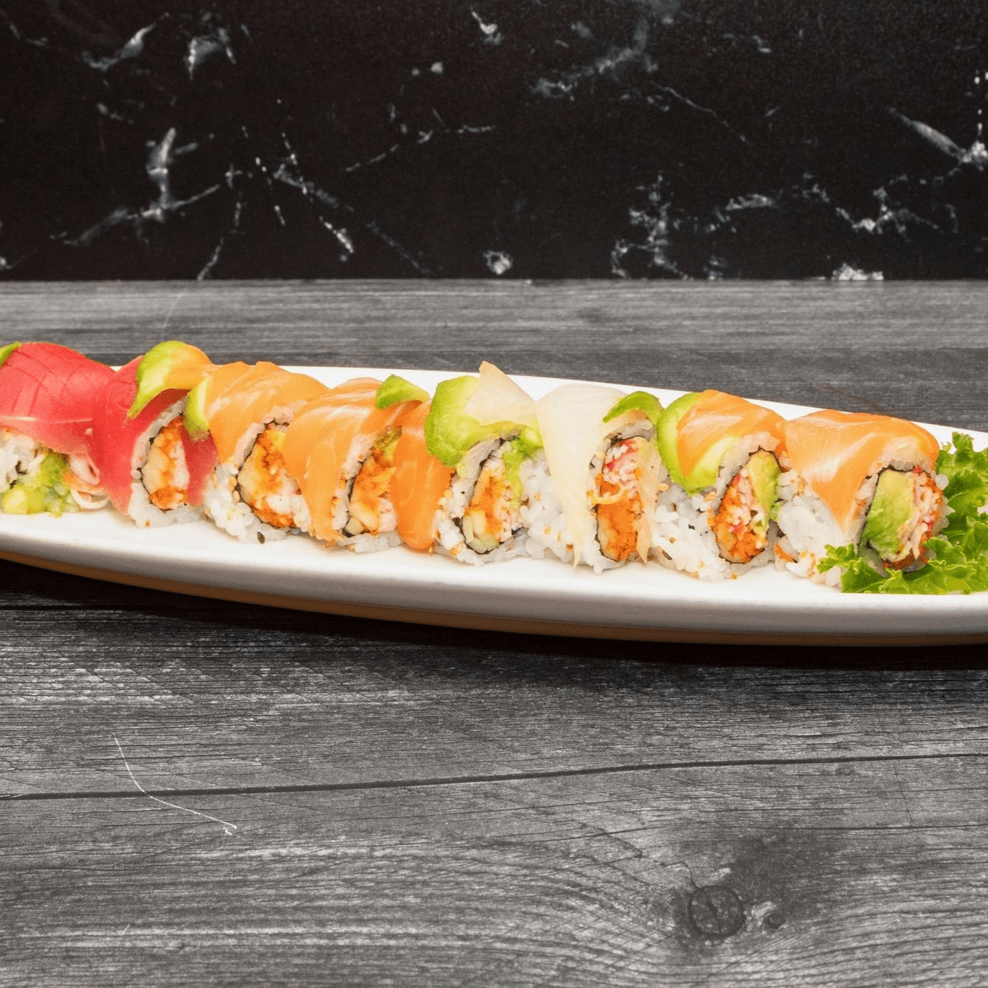 Inside: spicy crab, shrimp, avocado, lettuce. Outside: tuna, yellowtail, tobiko