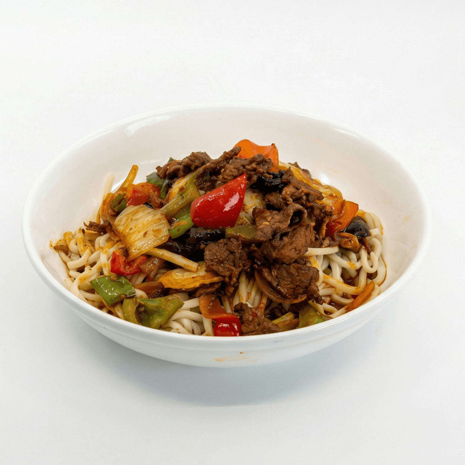 Chopped fresh hand-pulled noodles, wok-fried with beef or chicken & vegetables
