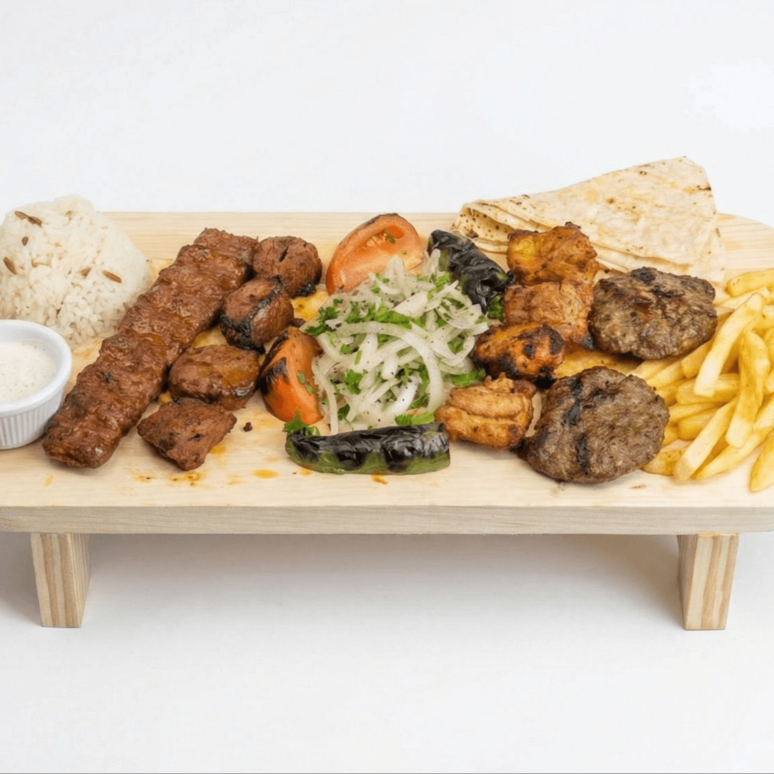 Family-style platter with doner kebab, adana (2 pcs), kofte (4 pcs), chicken (2 pcs), lamb ( 2 pcs). Served with rice, onion, and lavash. Ideal for 4 people